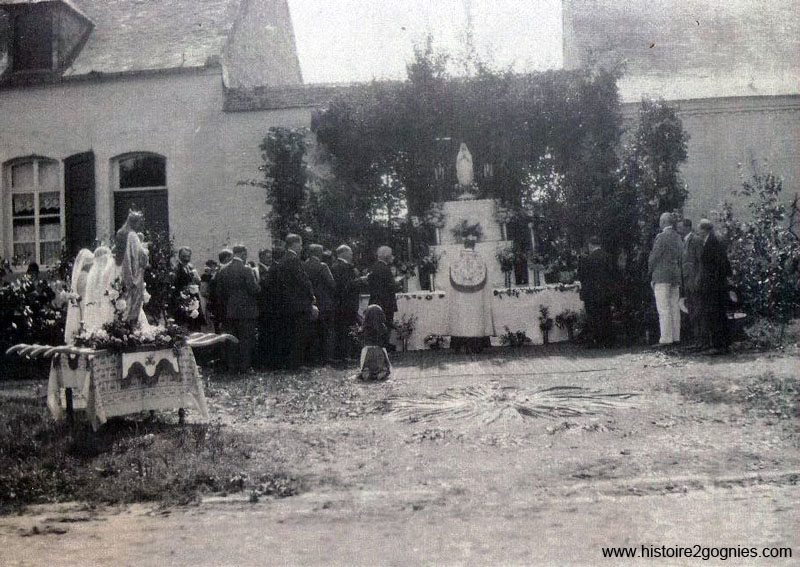 Procession du 15 août où pour les rogations. Ce reposoir est installé à l'entrée de la ferme José Verdonckt vers 1932